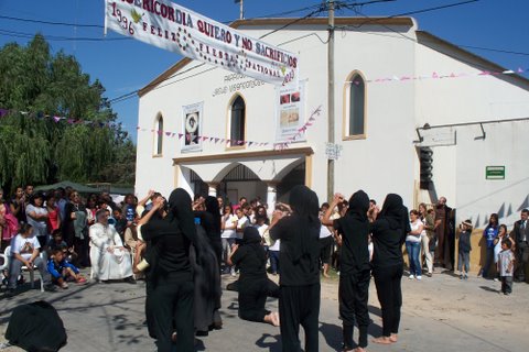 En cambio, al concluir la celebración, estaba preparada una “feria artesanal”, por un lado (muy concurrida) y un espectáculo inusual, que consistió en una especie de “auto sacramental” , llevado a cabo por un cuerpo de danzantes (y de ballet) de jóvenes oriundos de Garín, los cuales interpretaron una pieza que se refería a la acción oscura del pecado y de la injusticia, y a la acción liberadora de la Gracia y la Misericordia, tema acorde con la celebración. Llamó mucho la atención a los concurrentes, y el Obispo permaneció durante toda la actuación, que fue muy aplaudida, y al término de ella accedió con mucho gusto a tomarse fotos con los integrantes del cuerpo de danza, todos jóvenes, muchachas y muchachos, a los cuales felicitó.