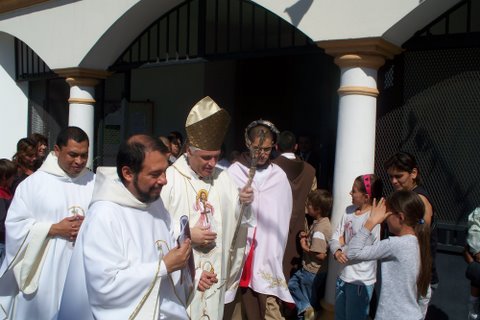 La fiesta popular, que incluyó una procesión orante y festiva encabezada por el cura párroco, R.P. Salatiel, dj y los hermanos del instituto, culminó en el amplio y luminoso templo parroquial, donde la esperaba el obispo Mons. Oscar Sarlinga, el cura párroco de Ntra. Sra. de Luján y Santos Apóstoles Pedro y Pablo de Campana (P. Joaquín Ocampo Álvarez, dj) y el P. Francisco dj., cura párroco de Santa Teresa de Jesús (Garín-Centro). Una multitud se hizo presente, entre los cuales religiosos, religiosas, jóvenes, familias, niños. El Obispo se refirió a la primera lectura de la Sagrada Escritura (Lectura de los Hechos de los Apóstoles 5, 12-16), en especial a los signos y prodigios que acompañaban a los Apóstoles en la comunidad eclesial primigenia, que es la misma Iglesia nuestra, con todos los dones del Espíritu Santo, y a la fama de aquéllos en el pueblo, a la fama de santidad que con toda verdad se daba sobre ellos, al aumento del número de los que creían en el Señor y a la curación de los enfermos, a tal punto que se ponían lo más cerca posible del paso de San Pedro “para que cuando Pedro pasara, por lo menos su sombra cubriera a alguno de ellos”. Asimismo, dijo Mons. Sarlinga, el maraviloso salmo que acabamos de meditar (SALMO Sal 117, 2-4. 22-24. 25-27ª) nos muestra la importancia de la alabanza para tener paz y prosperidad, aún sin ser exentos de sufrimiento o pruebas: “Sálvanos, Señor, asegúranos la prosperidad. ¡Bendito el que viene en nombre del Señor! Nosotros los bendecimos desde la Casa del Señor: el Señor es Dios, y Él nos ilumina”: bendecir y alabar –dijo- liberan el espíritu de “dolores inútiles”, porque nos asocia al único dolor redentor, que es la asociación a la Pasión de Cristo, y a su gloriosa Resurrección. A continuación el Obispo comentó la segunda lectura (Lectura del libro del Apocalipsis 1, 9-11a. 12-13. 17-19) y destacó como San Juan ve “a alguien semejante a un Hijo de hombre, revestido de una larga túnica”, es decir, a Jesucristo, verdadero Dios y verdadero Hombre, en su estado Resucitado, el cual lo primero que le dice al Vidente de Patmos es que no tenga miedo: «No temas: yo soy el Primero y el Ultimo, el Viviente. Estuve muerto, pero ahora vivo para siempre y tengo la llave de la Muerte y del Abismo. Escribe lo que has visto, lo que sucede ahora y lo que sucederá en el futuro», y así, de tal modo, dijo el Obispo que tampoco nosotros debemos tener miedo, porque sólo el Señor Misericordiso “tiene la llave de la historia, del sucederse de los hechos y de los acontecimientos, guiados por su Providencia”, para lo cual –acotó- se requiere una colaboración clave de nuestra inteligencia y voluntad libres. A continuación dijo que el fruto de la presencia de Jesús Resucitado es la verdadera “paz”, que es mucho más que la ausencia de conflicto, es “plenitud” (como lo sugiere la noción judaica de “shalom”). En efecto, el evangelio (Evangelio según san Juan 20, 19-31) manifiesta como Jesús expresa a los suyos un deseo-mandato: «¡La paz esté con ustedes! Como el Padre me envió a mí, yo también los envío a ustedes.» Al decirles esto, sopló sobre ellos y añadió: «Reciban el Espíritu Santo”. Es el Espíritu Santo, precisó, el que nos hace clamar, como el Apóstol Tomás: «¡Señor mío y Dios mío!». “También hoy –comentó Mons. Sarlinga- podemos tener miedo, podemos “mirar al cielo y no tener confianza”, pero, como “Iglesia peregrina”, sabemos que Jesús misericordioso es como el “piadoso Pelícano, cuya imagen tienen Vds. en el frontis de este espléndido altar”, piadoso Pelícano, porque, como narra la leyenda de esta ave, cuando sus hijos están desfallecientes, es capaz de abrirse el pecho para alimentarlos, tanto es el Amor que les tiene, que ha dado la vida por sus hijos, por todos nosotros. Tampoco abandonará a su Iglesia, ni abandonará a nadie que eleve sus ojos a Él pidiéndole paz y el don del Espíritu Santo”.
